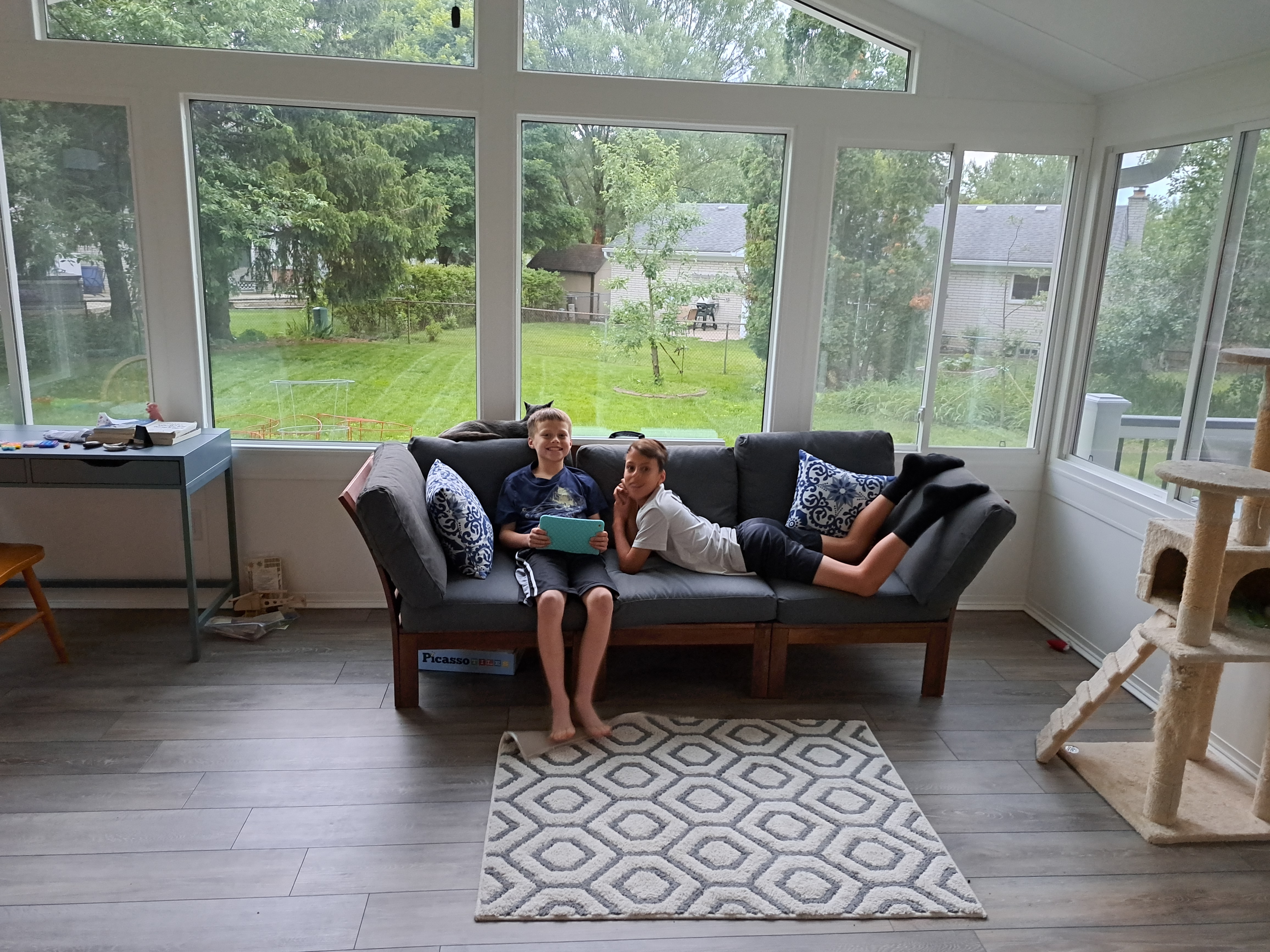boys being boys in the wonderful sun room which Jason planned and created, which of course is my favorite place to be